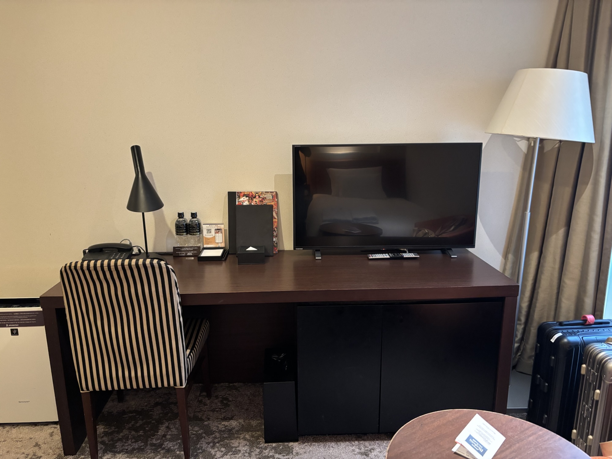 テレビはこれくらいの大きさで十分だし、YouTubeも見れるし、デスクも広めにとってあって使い勝手は良い。