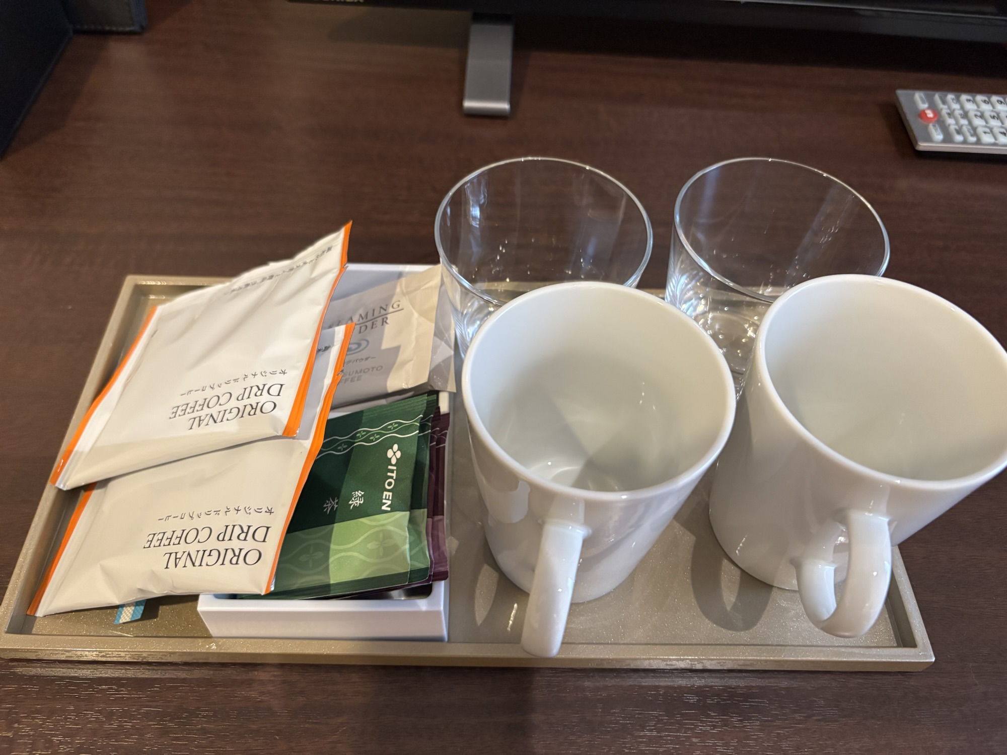 ドリップコーヒーやお茶のティーバッグ、マグカップとグラスが用意されているのもありがたい。