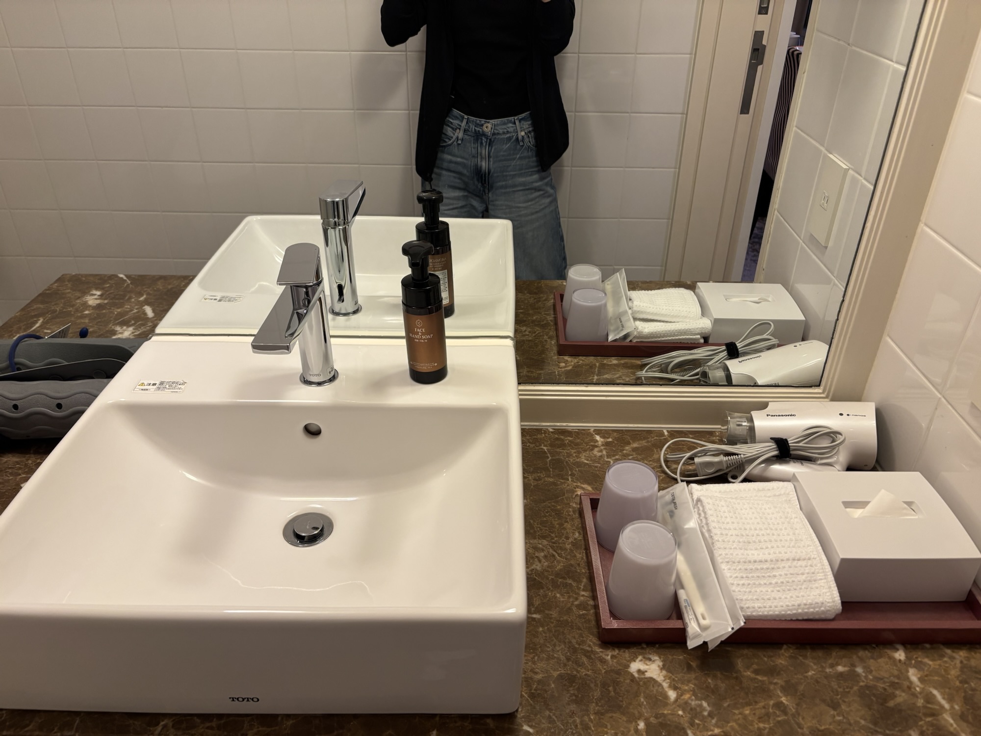 洗面横のスペースも広めに取られているので、持ち込んだ化粧品などを置くスペースにも困らなかった。