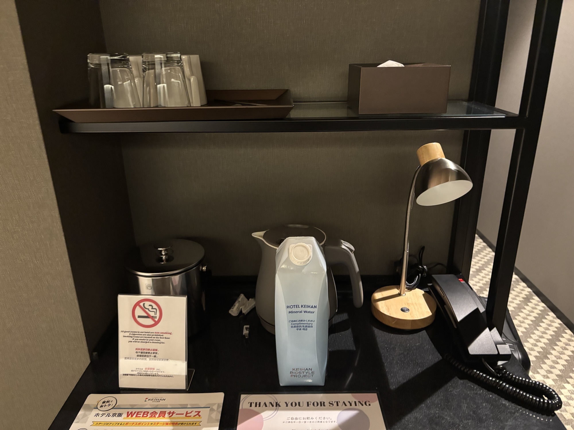 紙パック入りの水ボトルあり、ティーバッグやインスタントコーヒーなどはロビーフロアで好きなものを持ってくることができます。