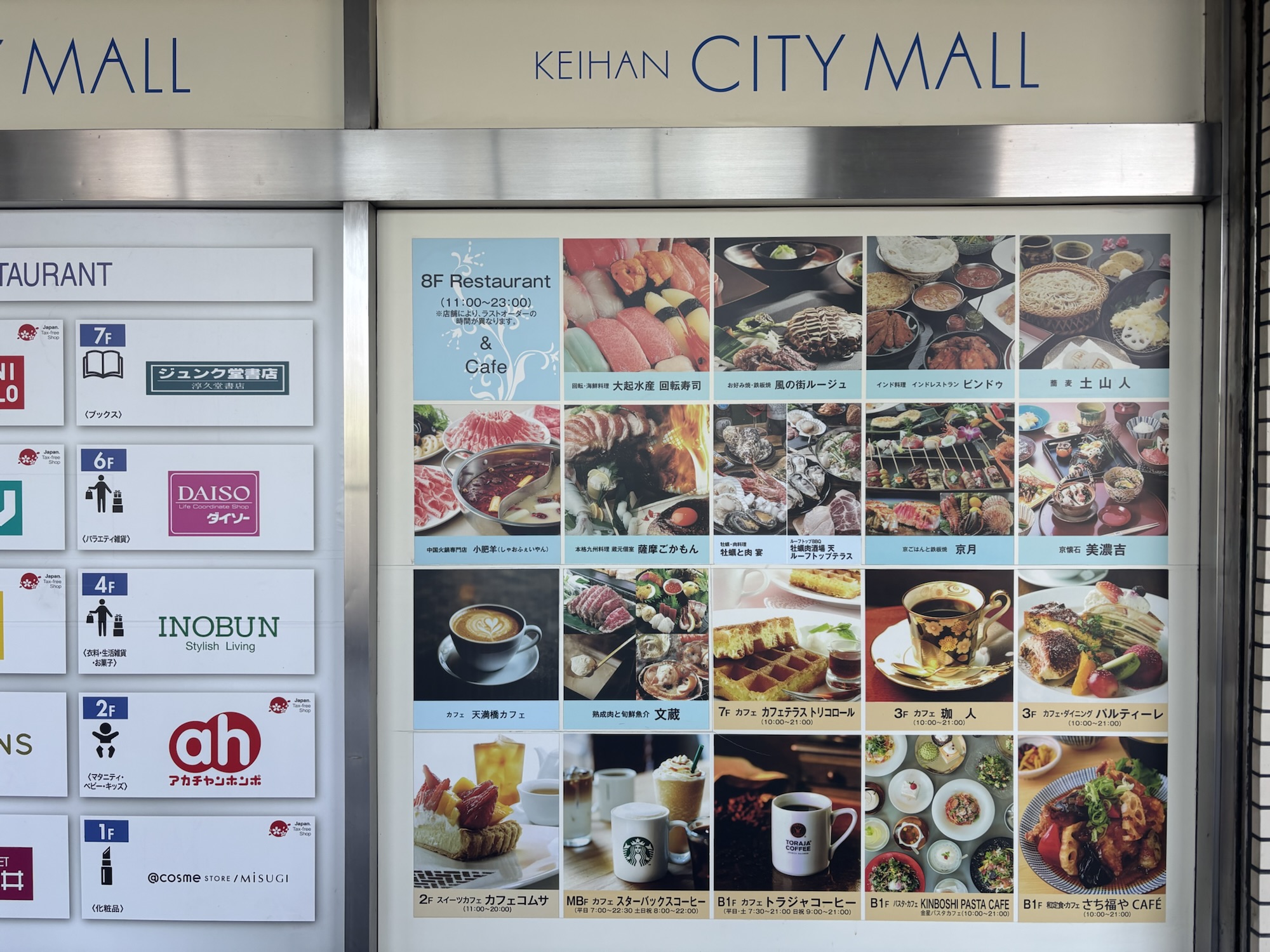 ホテルの目の前には商業施設の京阪シティモールがあり、飲食店もたくさん入ってるので食事には困りません。