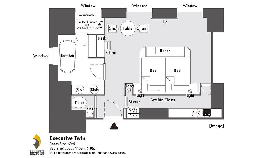 入ってすぐ右側にウォークインクローゼット、ミニバーがあり、バスルームはダブルシンクに独立したシャワールームがあります。