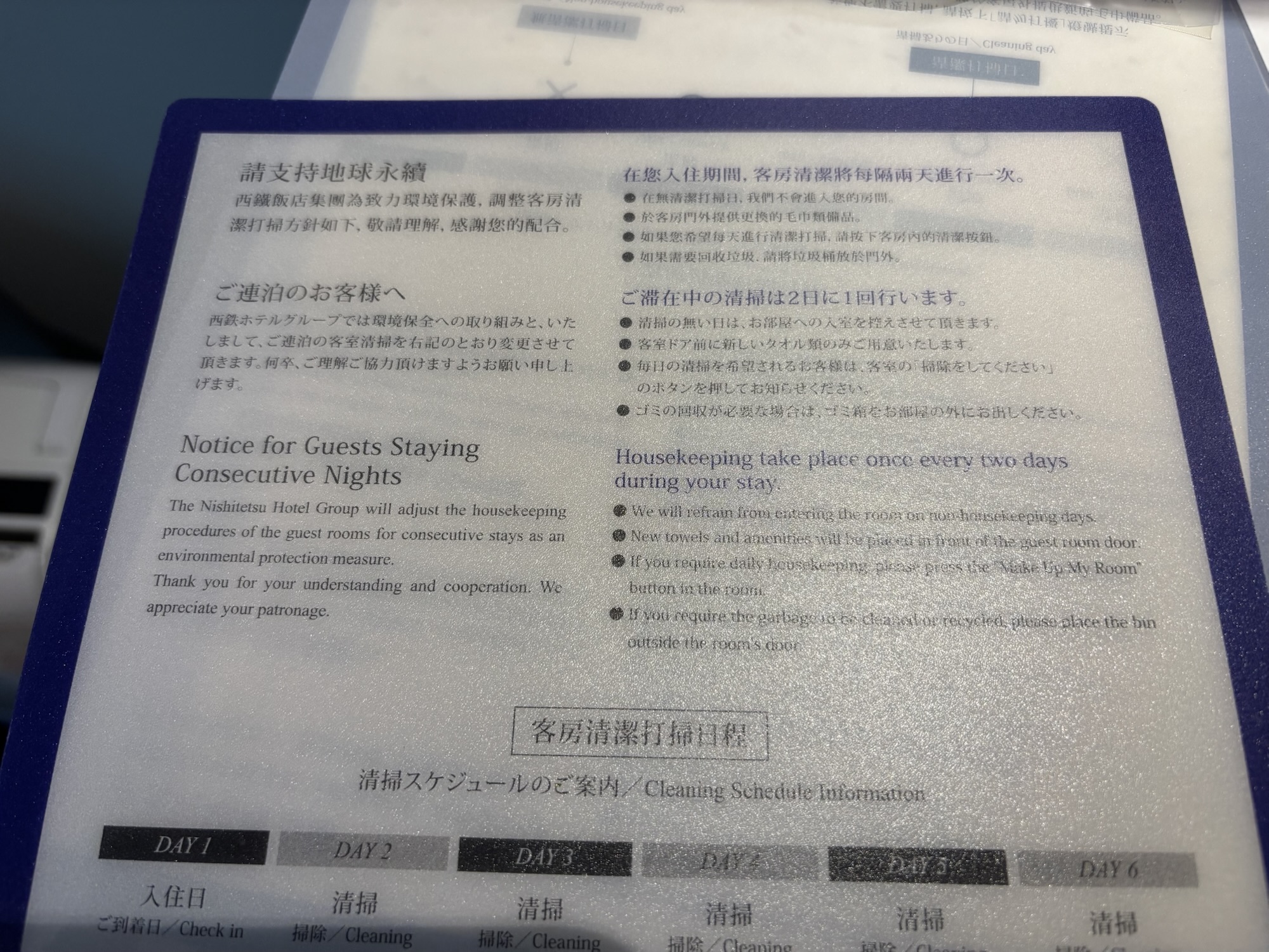 部屋の清掃に関しては2日に一回だそうですが、室内にあるボタンを押して清掃希望を伝えれば毎日清掃してもらえます。